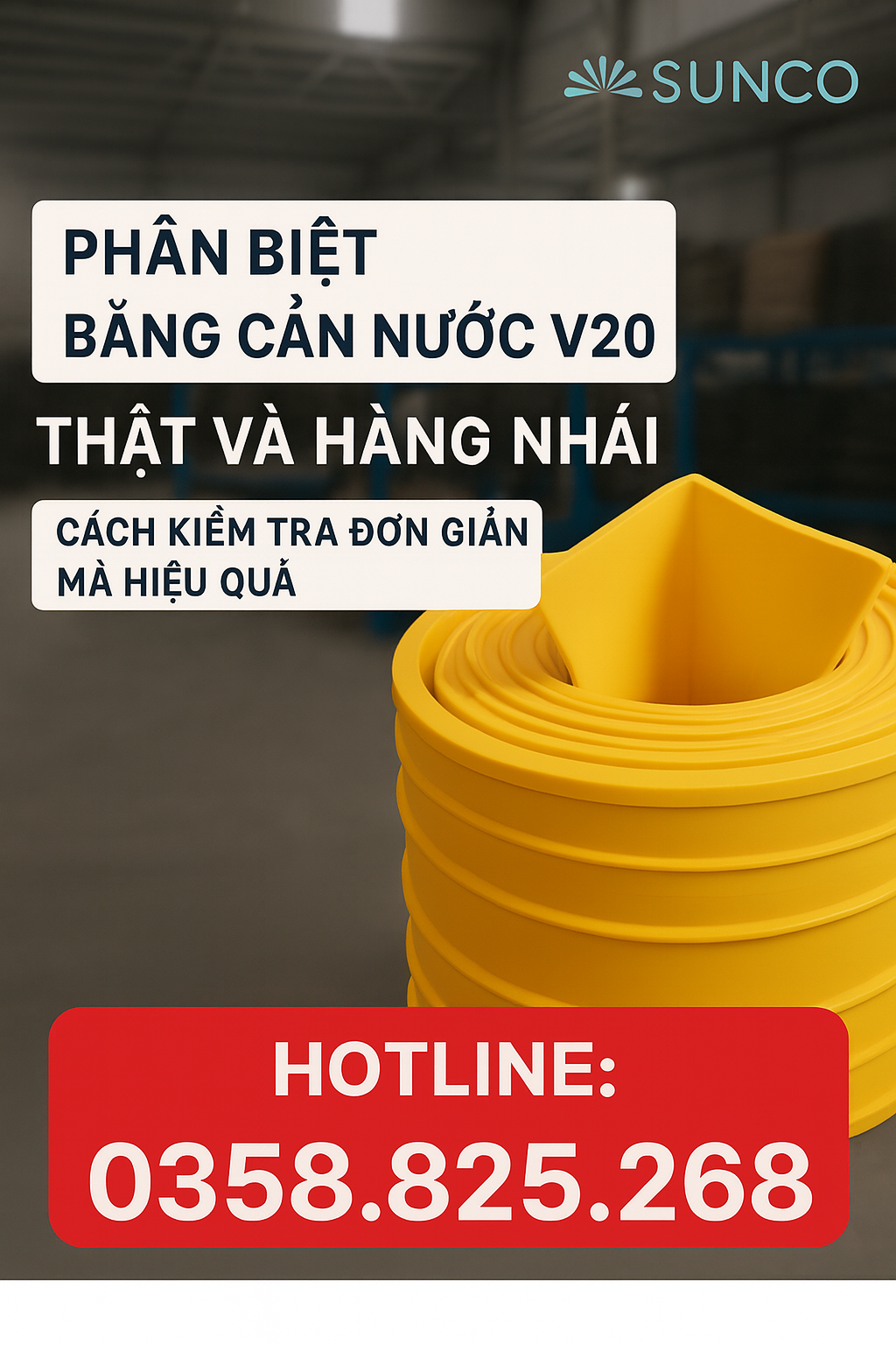 Bài viết dưới đây từ Công ty Địa Kỹ Thuật SUNCO sẽ giúp bạn nhận biết băng cản nước V20 thật và hàng nhái, hướng dẫn cách kiểm tra nhanh, đồng thời so sánh chi tiết các loại băng cản nước PVC phổ biến (V20, V25, V32, O20) để bạn chọn đúng sản phẩm cho công trình của mình.